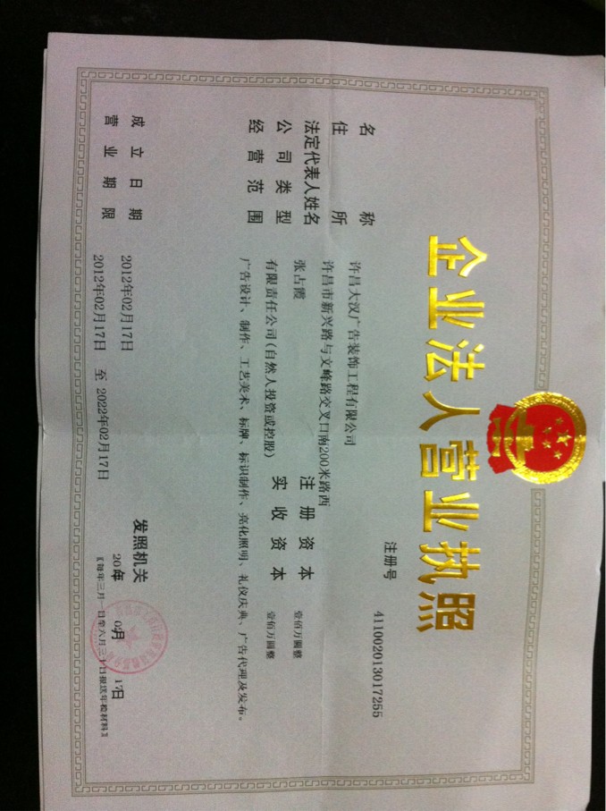 许昌大汉广告装饰工程有限公司创立于2009年,是集室内、外装饰、大型广告牌制作、超市形象制作、展览展示、雕刻喷绘、亮化工程、图文设计、排版印刷、户外广告、电视传媒、精准媒体等代理及发布为一体的综合型广告公司。 2011年8月公司又投资500万元并注册成立:“许昌大汉广告装饰工程有限公司”,并具备了装饰行业的三级资质。2012年5月我们公司成立了传媒部、装饰部、庆典部,公司总部落户鼎鑫商务楼,自此公司实现了四部门共同发展的多元化路线,这样的发展速度靠的是我们拥有一支年轻的、积极的、认真的、激情的精英团队。我们“快乐、高效的工作;积极、幸福的生活”。您可以在公司全力发挥您的才能,充分展现您的风采!公司有您更辉煌……
