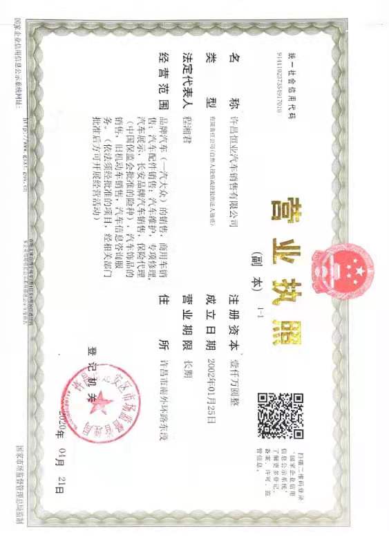 公司成立于2002年1月21日,注册资金壹仟万元,位于许昌市汽车北站向北600米路西,是集整车销售、售后服务、备件供应、信息反馈四位一体的长安品牌4S店。公司经营范围:汽车及汽车配件,维修售后服务,长安品牌的CS15、CS35、CS55、CS75、CS95、逸动、逸动XT、凌轩、锐成CC等。公司性质为私有制公司,并在信阳、郑州等地设有分公司。