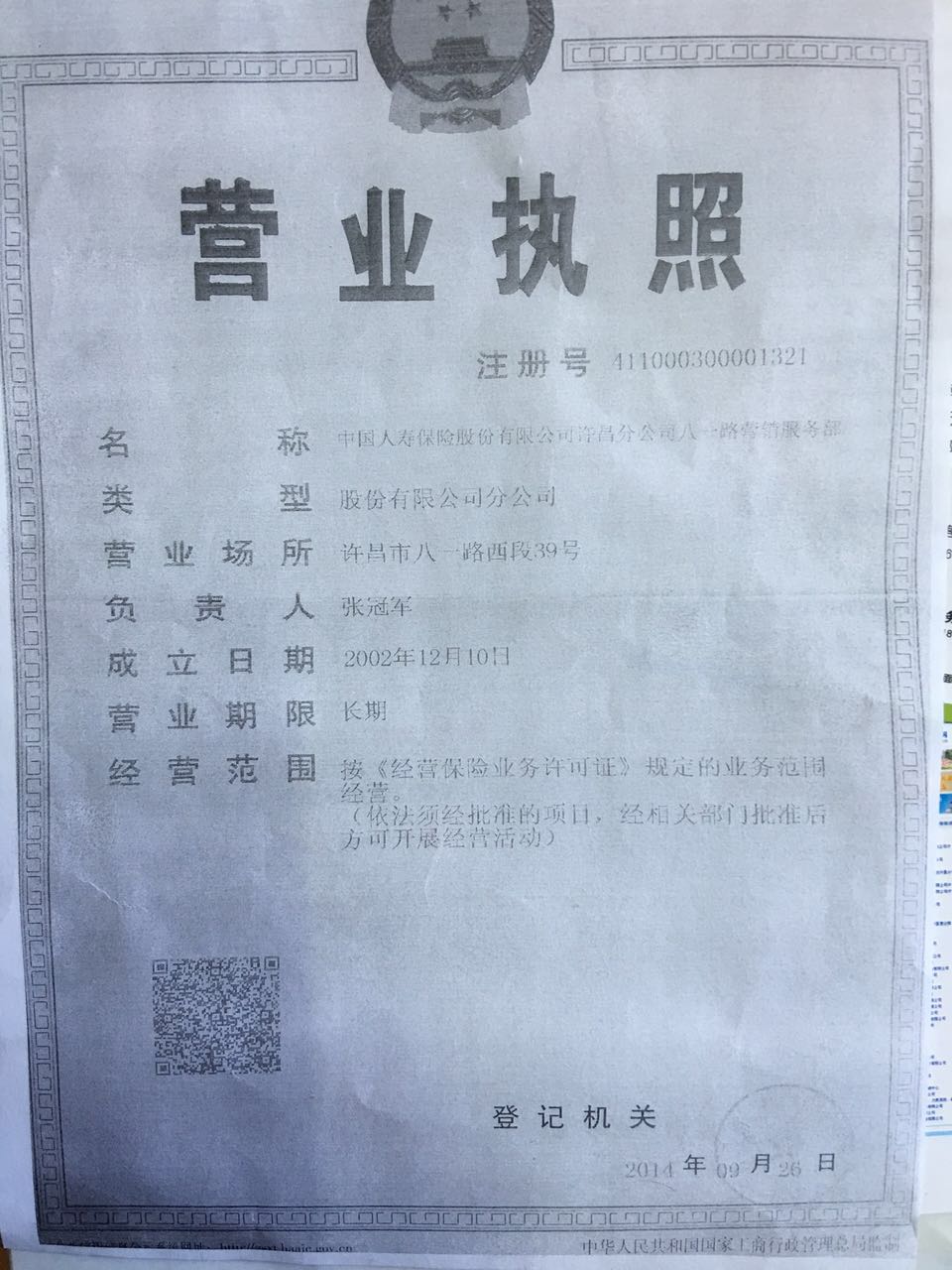 中国人寿保险股份有限公司许昌分公司八一路营销服务部