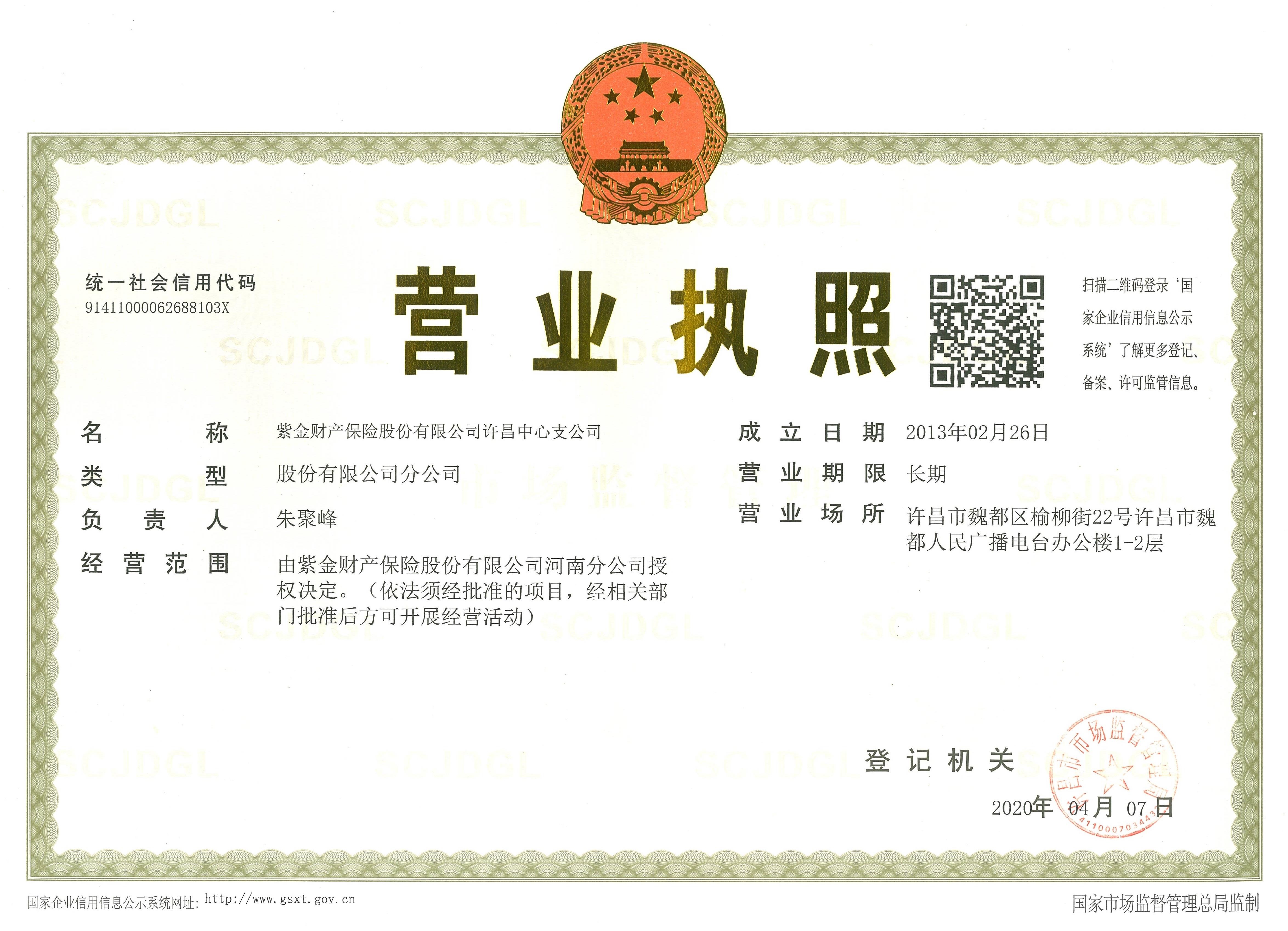 紫金财产保险股份有限公司许昌中心支公司